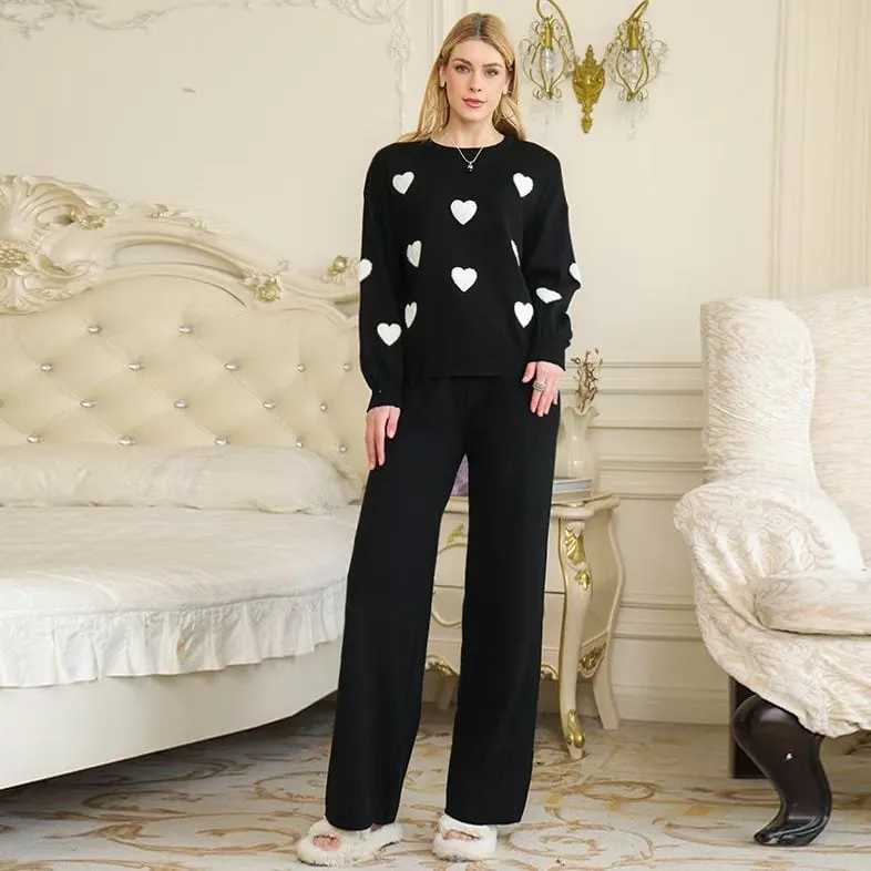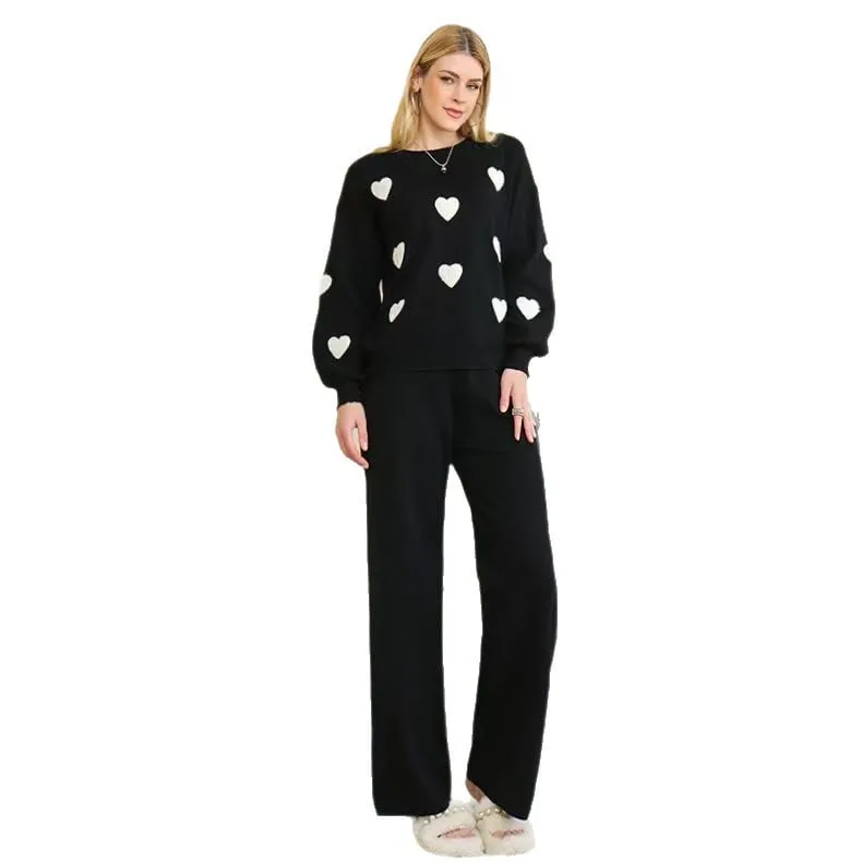 Fall New Arrival: Round Neck Heart Print Long Sleeve Oversized Knit Sweater + High-Waisted Wide-Leg Pants Two-Piece Set for Women