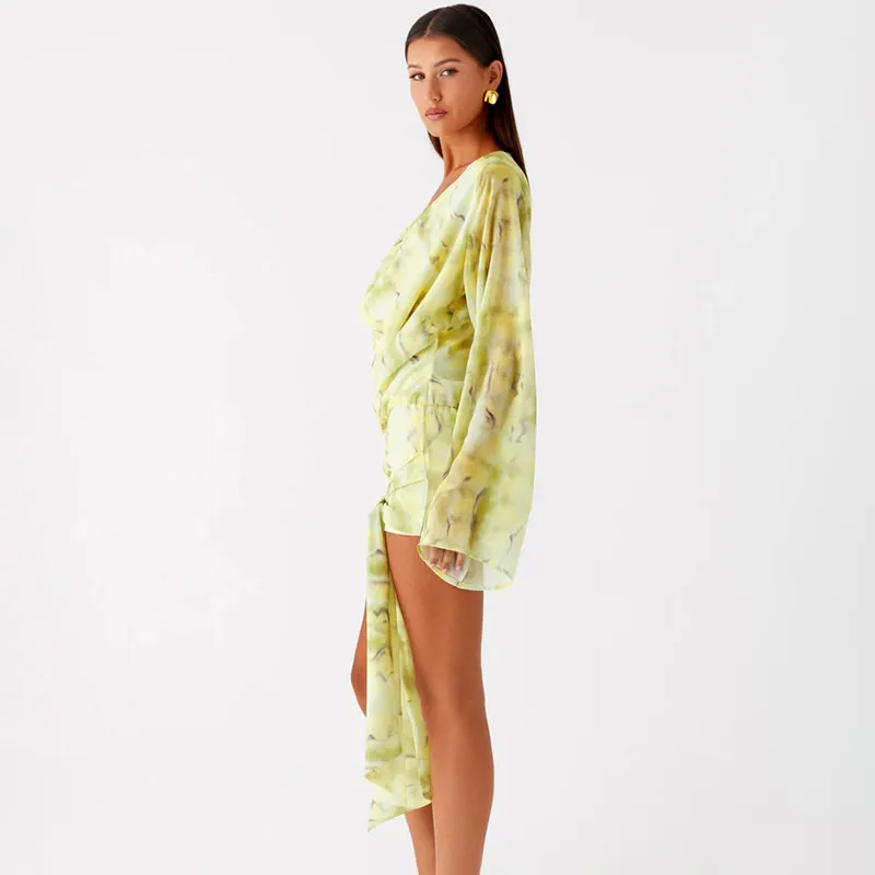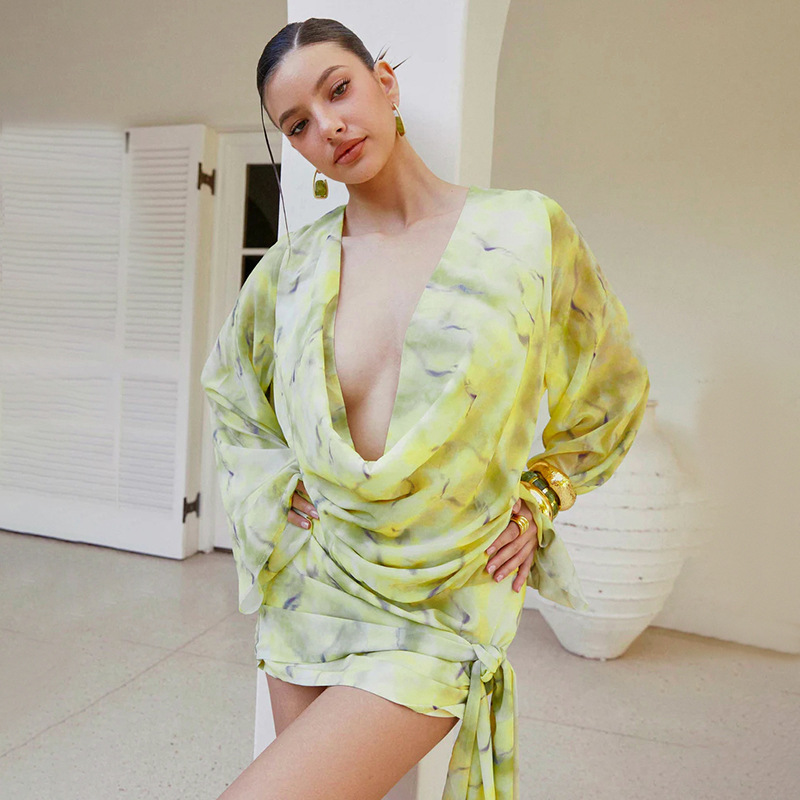European & American Fall New Arrival Floral Tie-Dye Print Off-Shoulder Bell-Sleeve Ribbon-Trimmed Short Dress